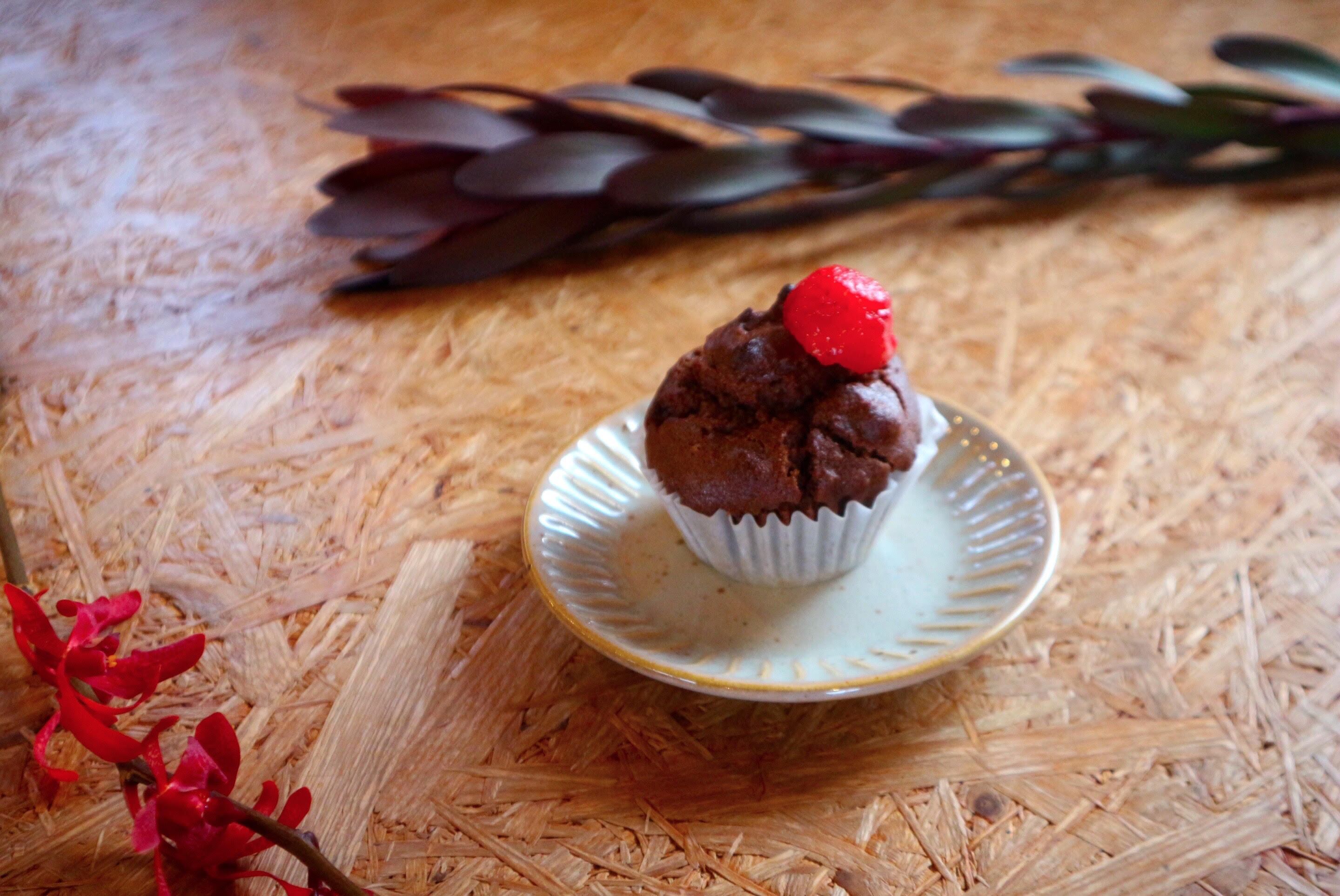 米粉のいちごココアマフィンは、甘酸っぱいイチゴと純ココアの香りが広がる。